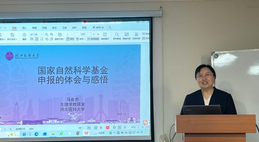 为切实提高国家自然科学基金项目申报质量,12月2日,基础医学院组织召开国家自然科学基金项目申报推进会。会议特邀河北医科大学马会杰教授担任主讲嘉宾,以“国家自然科学基金申报的体会与感悟”为题分享宝贵经验。院长王红杰、副院长周国强及学院拟申报2026年国家自然科学基金项目的教师参加会议。会议由周国强主持。
