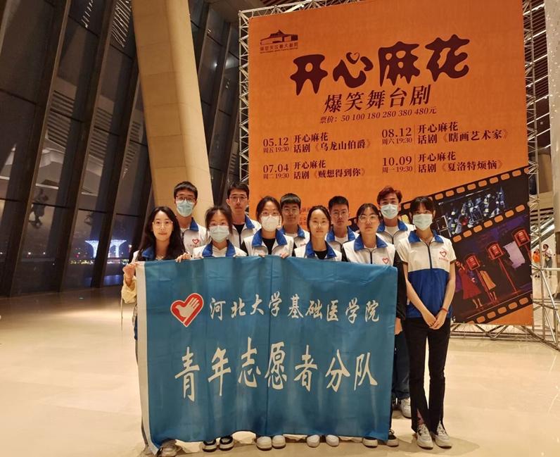 2023年4月24日和5月3日,基础医学院青年志愿者分队在保定关汉卿大剧院开展了志愿活动。成员们身着统一的服装,在剧院内帮助维护现场秩序以保证话剧演出的顺利进行。