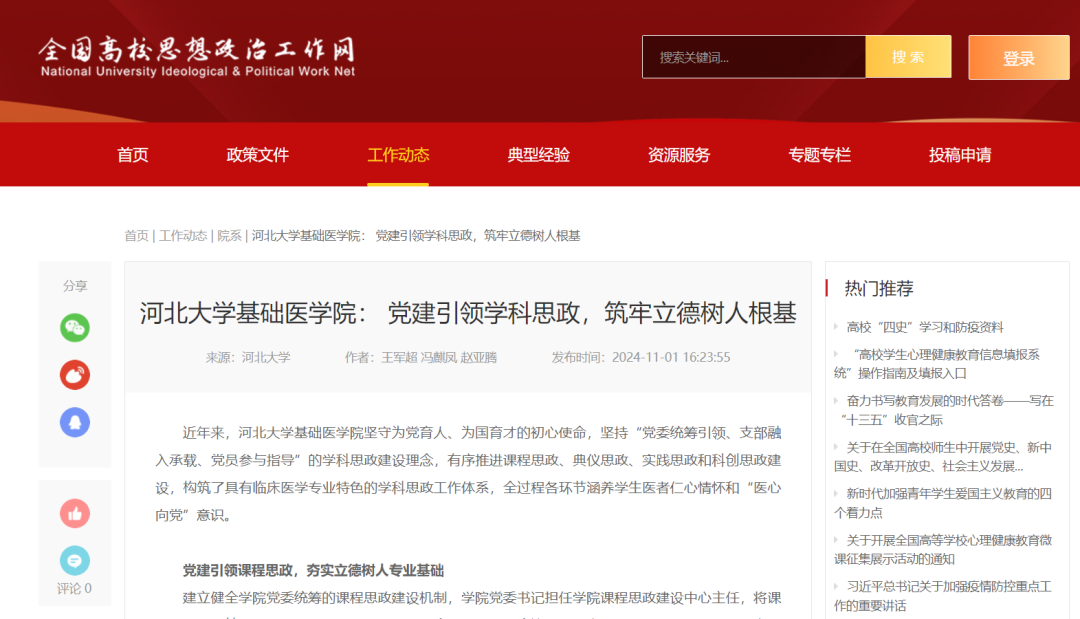 2024年11月1日,全国高校思想政治工作网以《河北大学基础医学院:党建引领学科思政,筑牢立德树人根基》为题报道了我院坚持“党委统筹引领、支部融入承载、党员参与指导”的学科思政建设理念,有序推进课程思政、典仪思政、实践思政和科创思政建设的先进做法和典型经验。