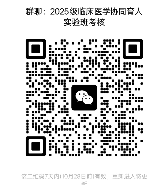 根据《关于选拔2025级临床医学跨学科协同育人实验班学生的通知》安排,学院对报名2025级临床医学跨学科协同育人实验班选拔的学生进行资格审查、汇总,有132名学生符合报名条件,进入选拔考核,现将学生名单进行公布。 请符合条件的学生扫描下面二维码加入2025级临床医学协同育人实验班考核群。